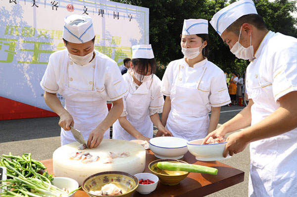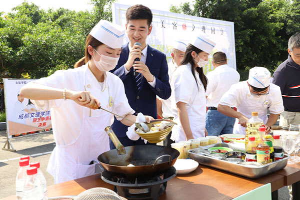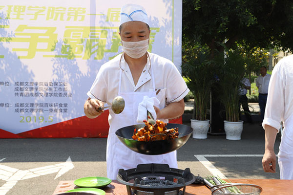 5月23日下午3时,我校第一届“厨王争霸”赛决赛于社团文化广场顺利举行。我校党委书记高华锦等领导莅临现场,各职能部门负责人及各二级学院师生代表参与。四川彬蓉餐饮管理有限公司董事长岳龙斌,总经理吴名兵,成都培峰餐饮管理有限公司董事长李培,总经理余宝元,管理学院酒店管理专业教师刘飞担任本次比赛评委。团体组一等奖由经济学院获得,教师组一等奖由文法学院辅导员袁帅获得。