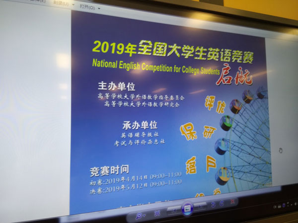 经过近2个月的精心宣传和组织,2019年全国大学生英语竞赛(NECCS)初赛于4月14日上午9点在我校明德楼六个考场鸣锣开赛。此次竞赛分为C、D两个类别,我校各个学院共计155人报名参加,其中C类参加人数144人,D类11人。