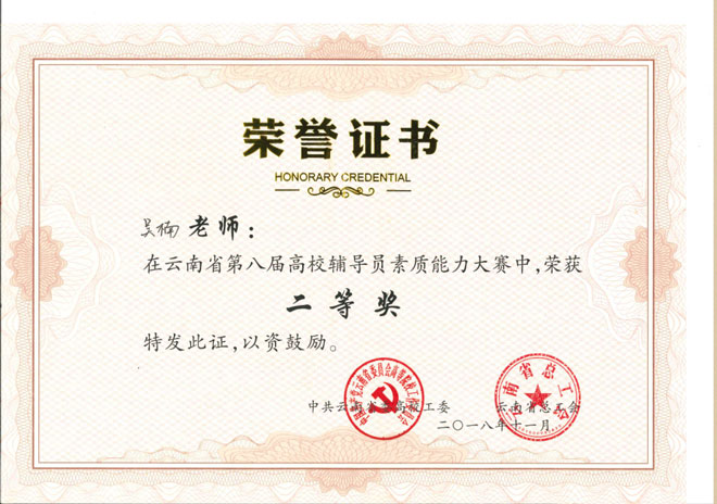 2018年11月29至30日,由省委高校工委、省总工会主办,云南财经大学承办的云南省第八届高校辅导员素质能力大赛决赛在云南财经大学举行,来自全省64所高校的78名高校辅导员聚集一堂,交流思想,畅谈心得,进行了辅导员工作技能的大比拼。我校湿地学院辅导员吴楠代表学校参加比赛,并获得大赛二等奖。我校获得优秀组织奖。