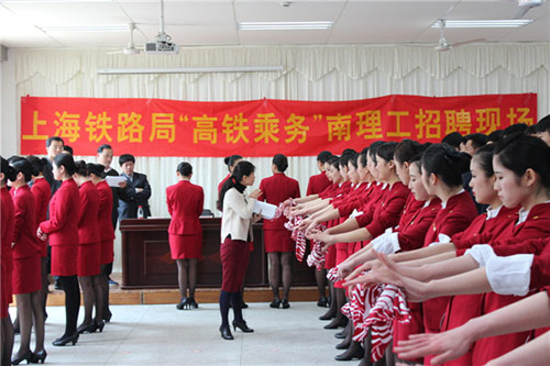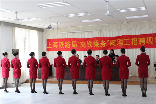 4月14日上午10点,上海铁路局高铁乘务员校园专场招聘会在我校艺文馆隆重举行,我院国际空乘班2016届毕业生141名同学参加面试。其中预科班同学报名46名,录取35名,录取率近80%,由于乘务工作的外形要求,基本条件就将身高限定在了女生162厘米和男生172厘米以上,还要求形象好、气质佳、普通话标准、语言表达能力强、综合素质高。最终录取了86名同学。